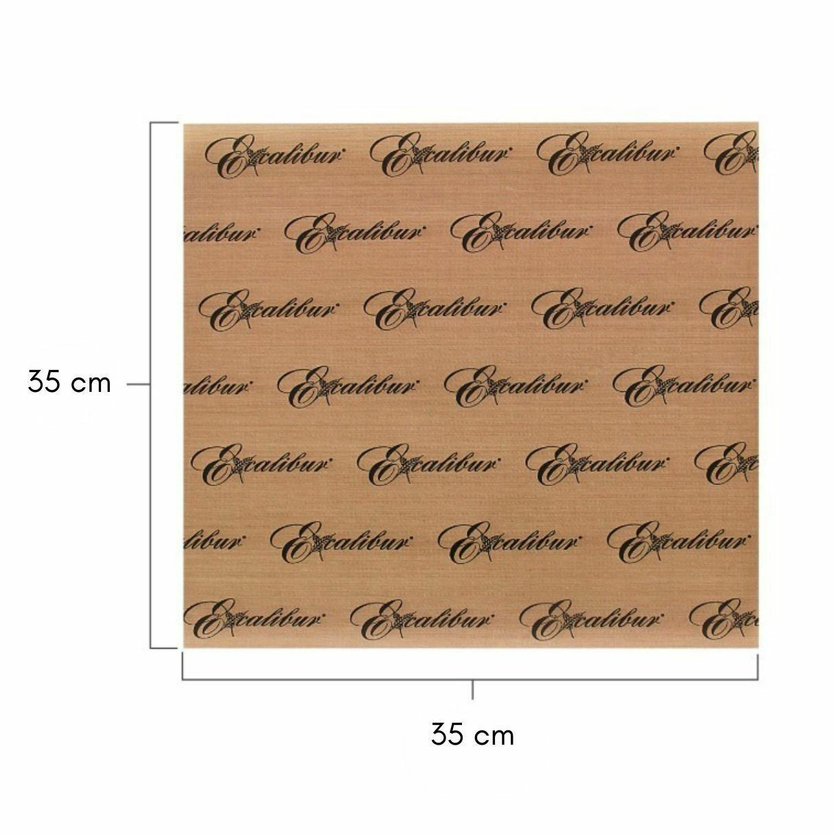 Excalibur ParaFlexx Premium non-stick dehydrator sheet with 35 cm by 35 cm size diagram.