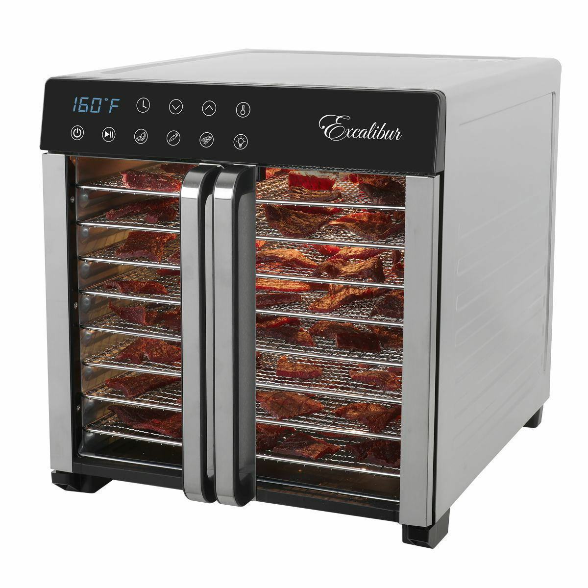 The new Excalibur 8 Tray Select Series Food Dehydrator has an adjustable thermostat, digital LED control, tempered glass french doors and chrome plated trays